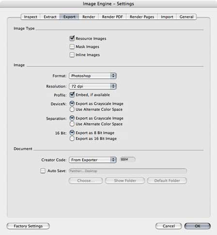 Creator Code: This pop-up menu allows the user to assign a creator code to the produced image files. The creator code determines the default application that will open the file by double clicking the symbol in a Finder window.