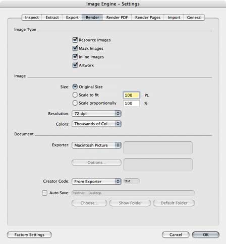 Exporter: The pop-up menu allows the user to choose the exporter. The menu includes the built-in exporter "Macintosh Picture" and a list of QuickTime Exporters. QuickTime Exporters are available only, if QuickTime is properly installed. The available types and options depend on the version of QuickTime. The list is initialized at the launch time of the hosting Adobe Acrobat application.