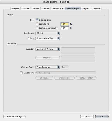 Exporter: The pop-up menu allows the user to choose the exporter. The menu includes the built-in exporter "Macintosh Picture" and a list of QuickTime Exporters. QuickTime Exporters are available only, if QuickTime is properly installed. The available types and options depend on the version of QuickTime. The list is initialized at the launch time of the hosting Adobe Acrobat application.
