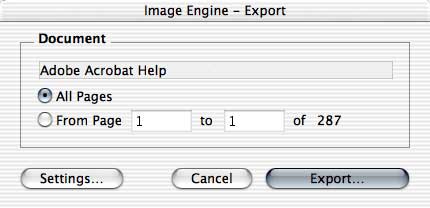 To apply the Export function to the front document of Adobe Acrobat, choose the menu "ImageEngine" > "Export