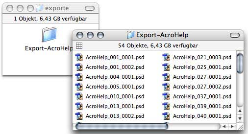 The result of the Export function is a sub folder inside the destination folder, filled with the exported images as Photoshop files.