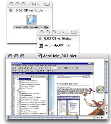 The Render Selection function uses the render method of the Adobe Acrobat application to render the current graphics selection of the front document as image. The image is saved either as Macintosh Picture or in the corresponding format when using one of the QuickTime Image Exporters of Mac OS.