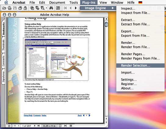 To apply the Render Selection function, activate the Graphics Select Tool of the Adobe Acrobat application and select the desired area of the document. Choose the menu "ImageEngine" > "Render Selection