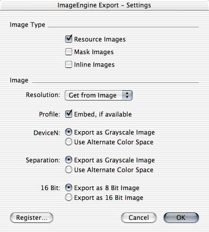 16 Bit: ImageNegine Export supports images with 16 bits per color component, introduced with PDF 1.5. Use this setting to decide whether to export 16 bit images with 8 bits or 16 bits per color component.