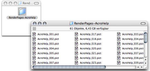 The Render Pages function uses the render method of the Adobe Acrobat application to render views of the pages of the source PDF document as images. The images are saved either as Macintosh Pictures or in the corresponding format when using one of the QuickTime Image Exporters of Mac OS.